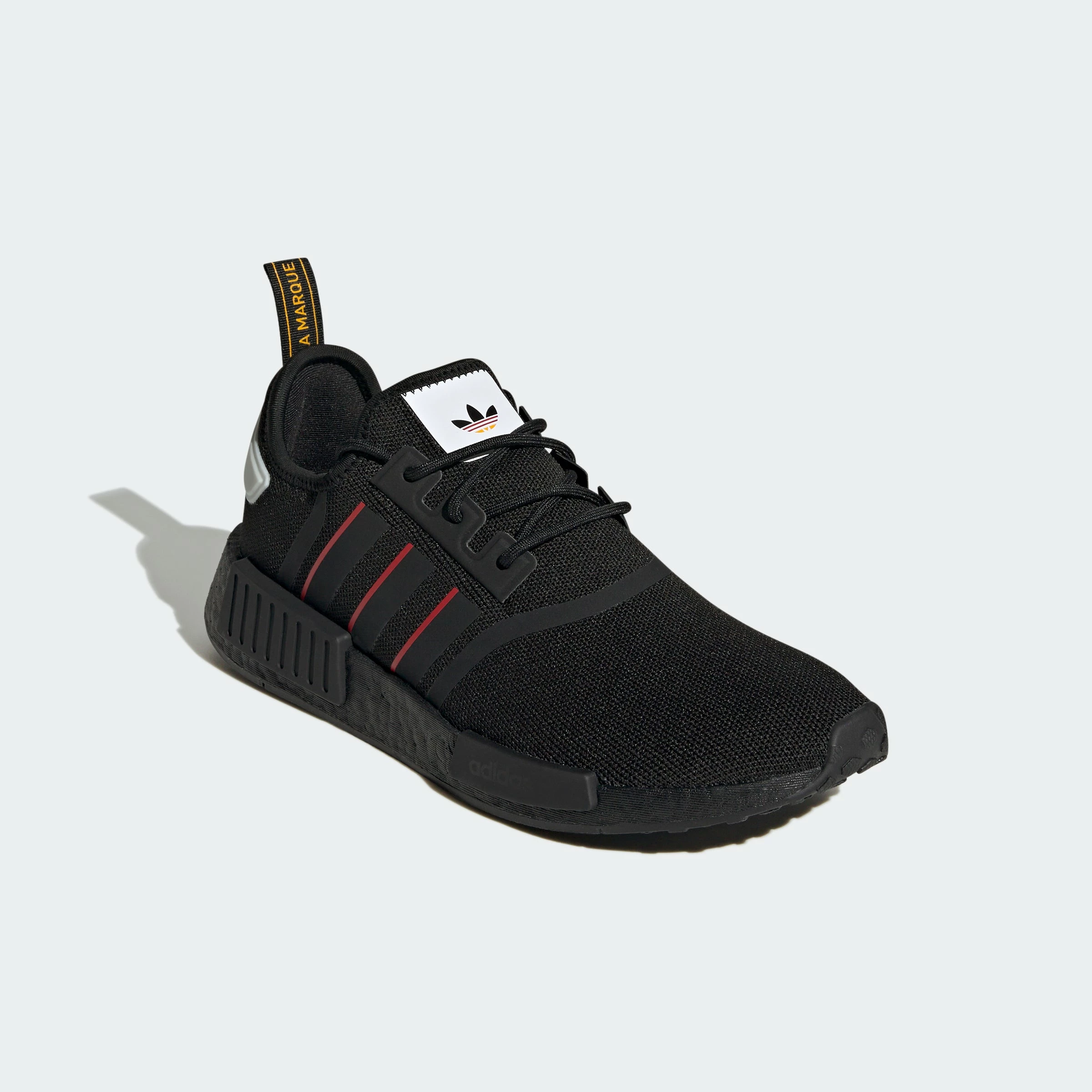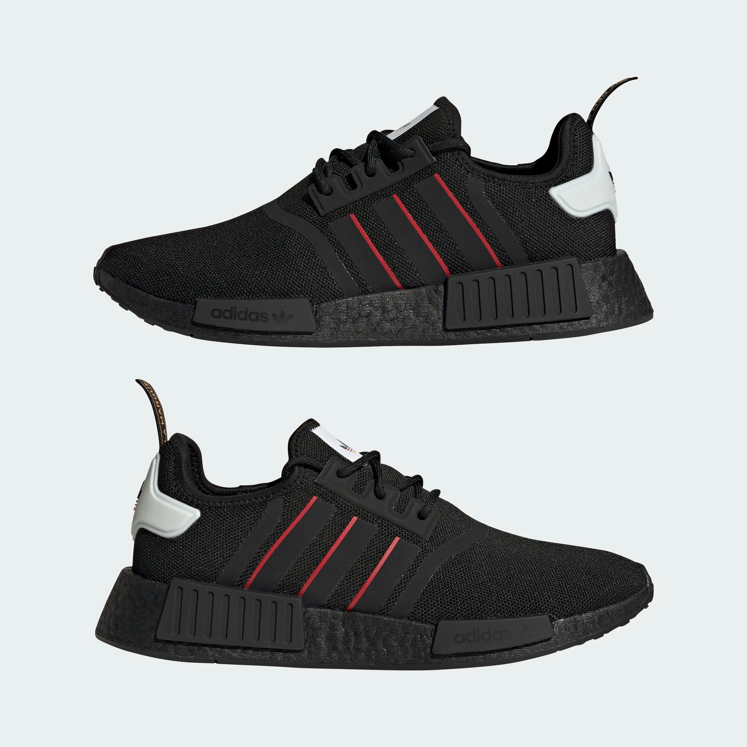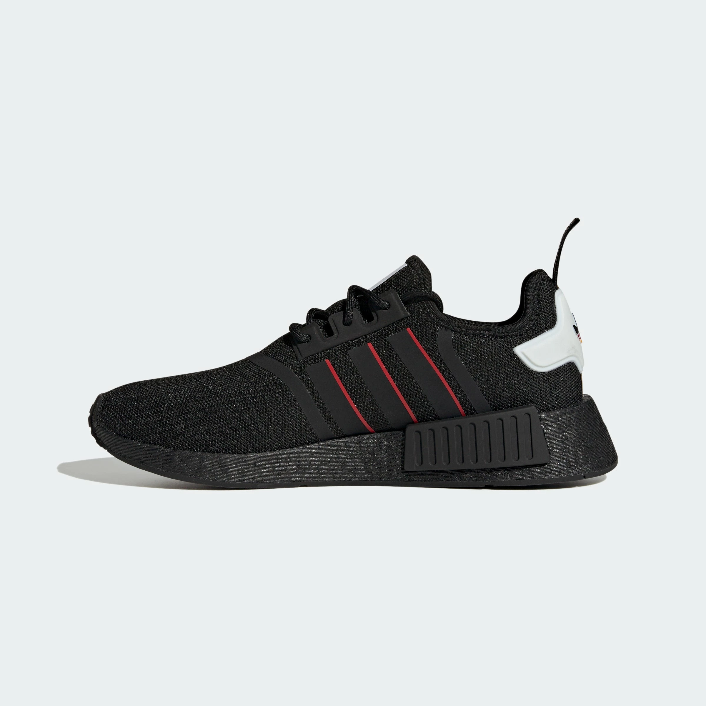 Made for the modern hustle. Gear up in adidas NMD_R1s and hit the ground running in comfort and style. The adidas kicks come in a black colorway with pops of red. The NMDs are constructed of soft, stretchy knit with Boost cushioning. The flexible uppers give your feet a snug fit and feels as comfy as socks. Stay energized on the go and in style.