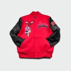 Calling all Chicago Bulls fans! This season the Pro Standard Chicago Bulls Varsity Jacket comes in a wool body with PU leather sleeves. Embroidered Chicago applique logos decorate this varsity style jacket all around. Tuck your hands in the slip pockets and keep warm with the mock collar. The front closes with a full zipper and snaps.
