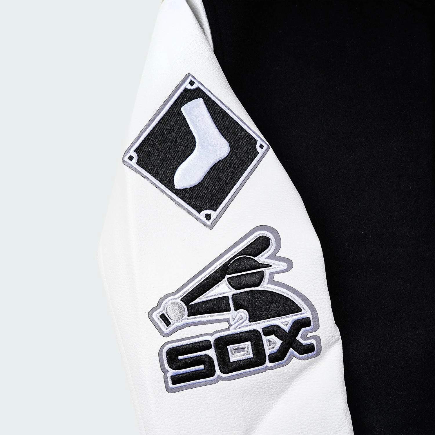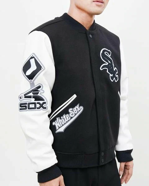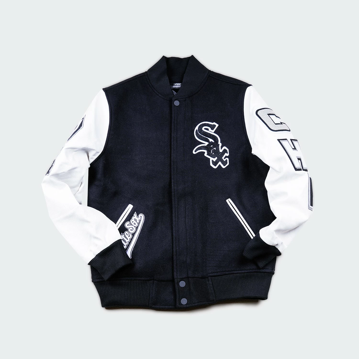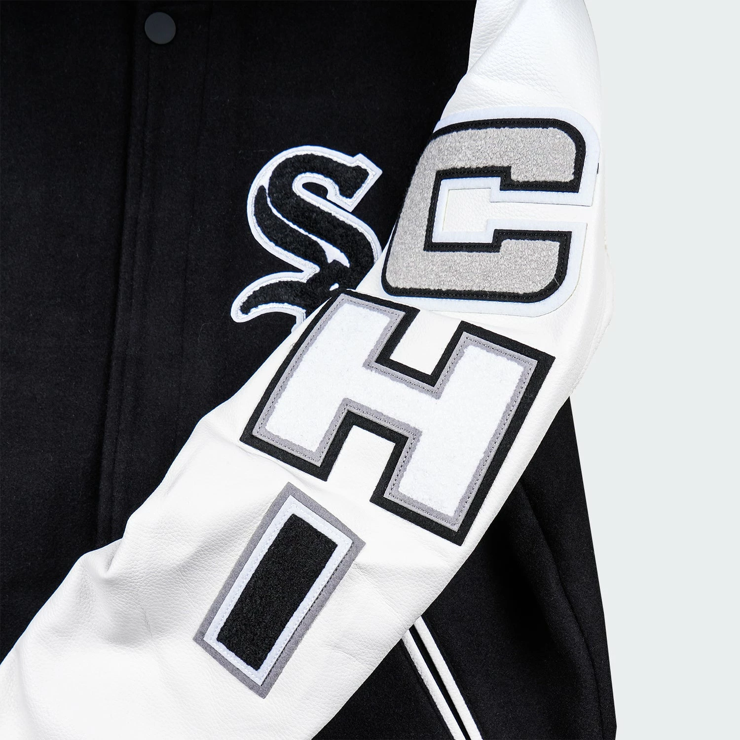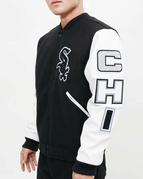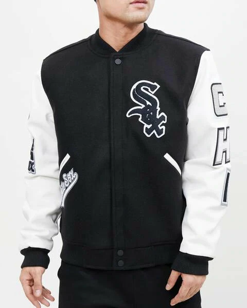 Chicago White Sox Fans! This season the Pro Standard Chicago White Sox Varsity Jacket comes in a wool body with PU leather sleeves. Embroidered Chicago applique logos decorate this varsity style jacket all around. Tuck your hands in the slip pockets and keep warm with the mock collar. The front closes with a full zipper and snaps.