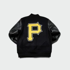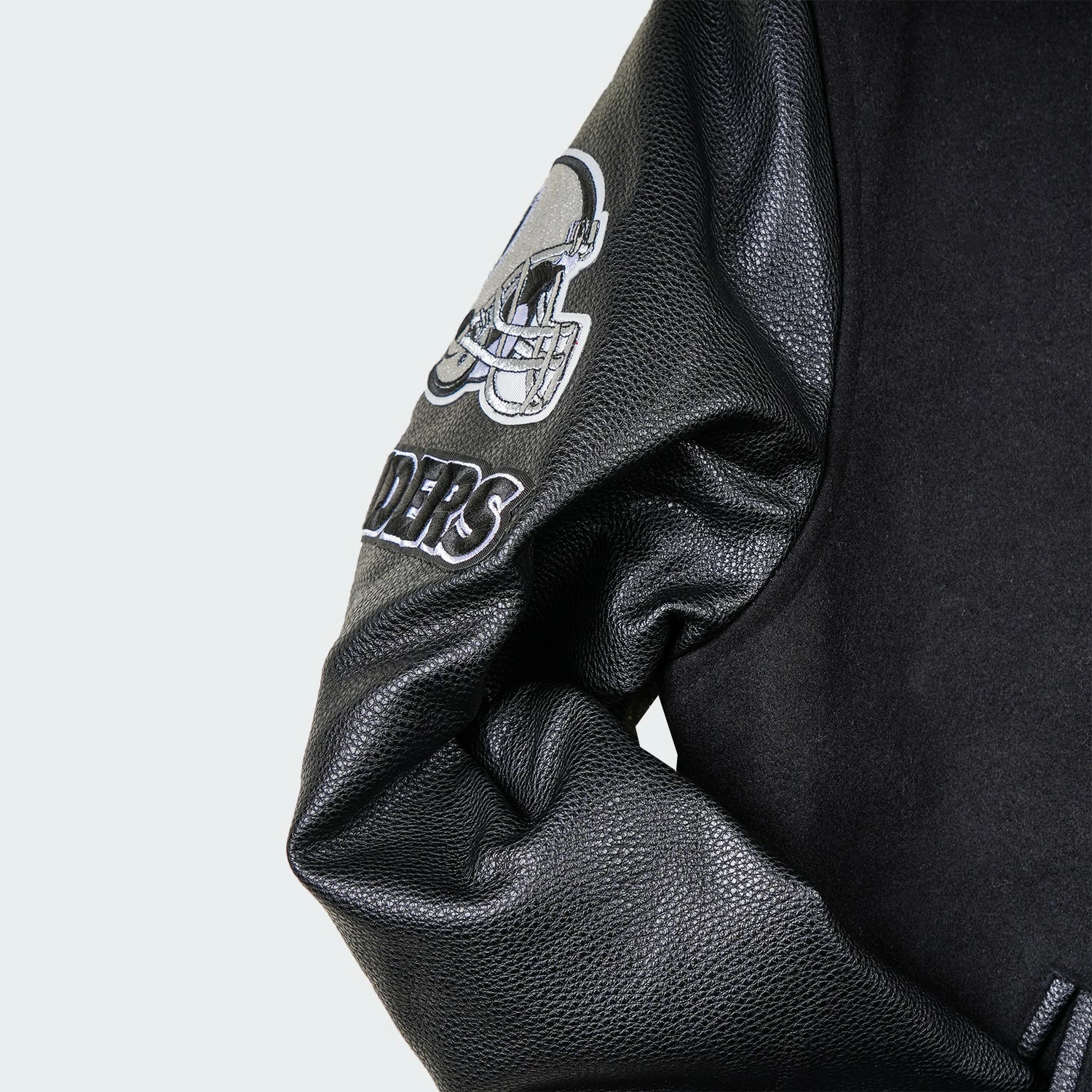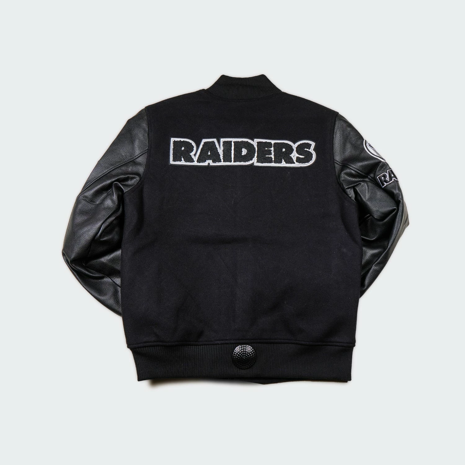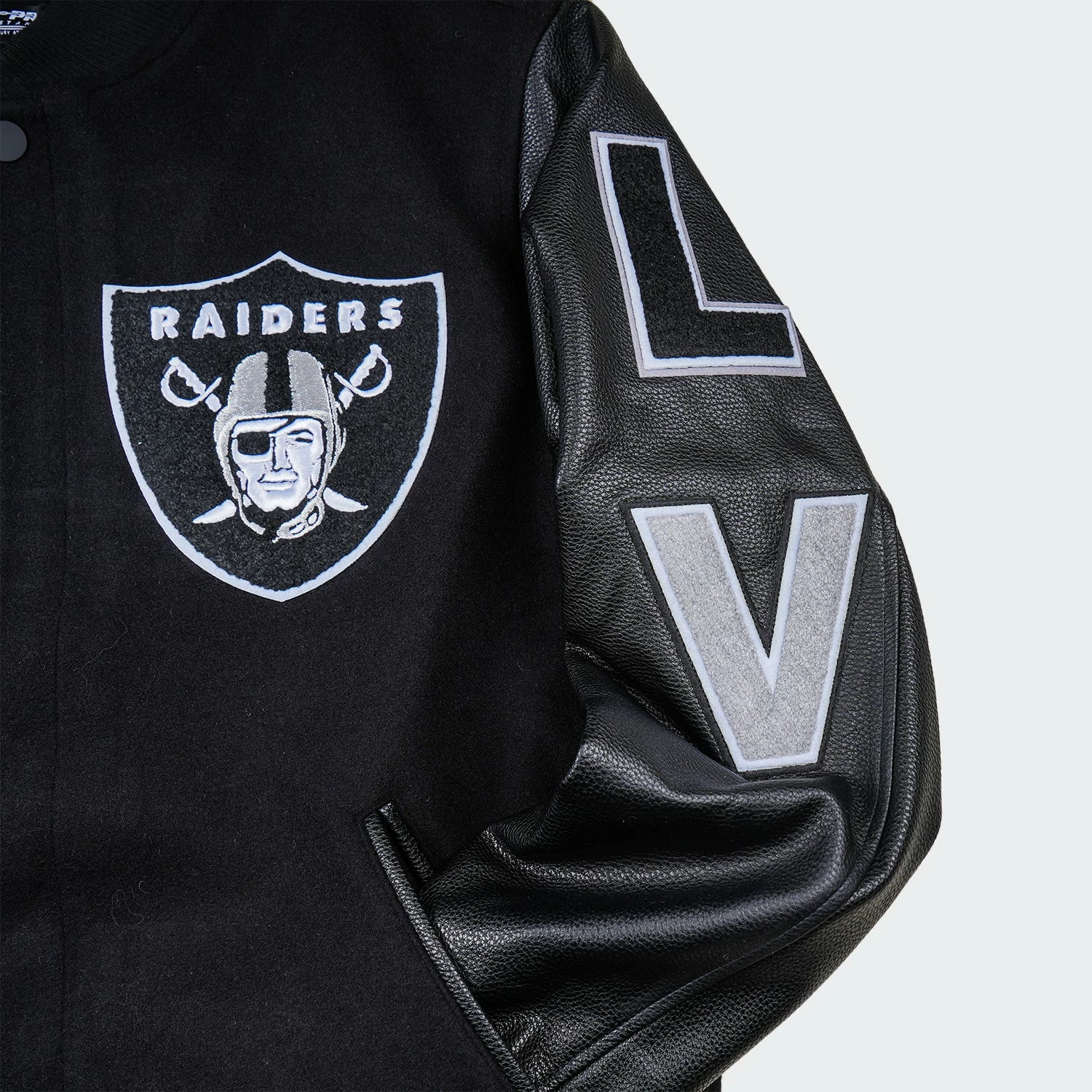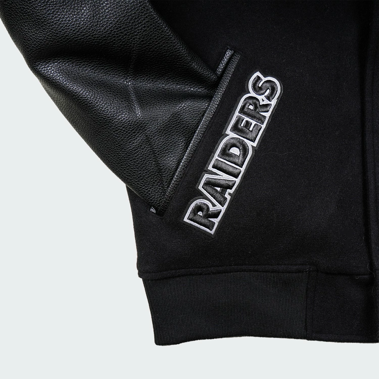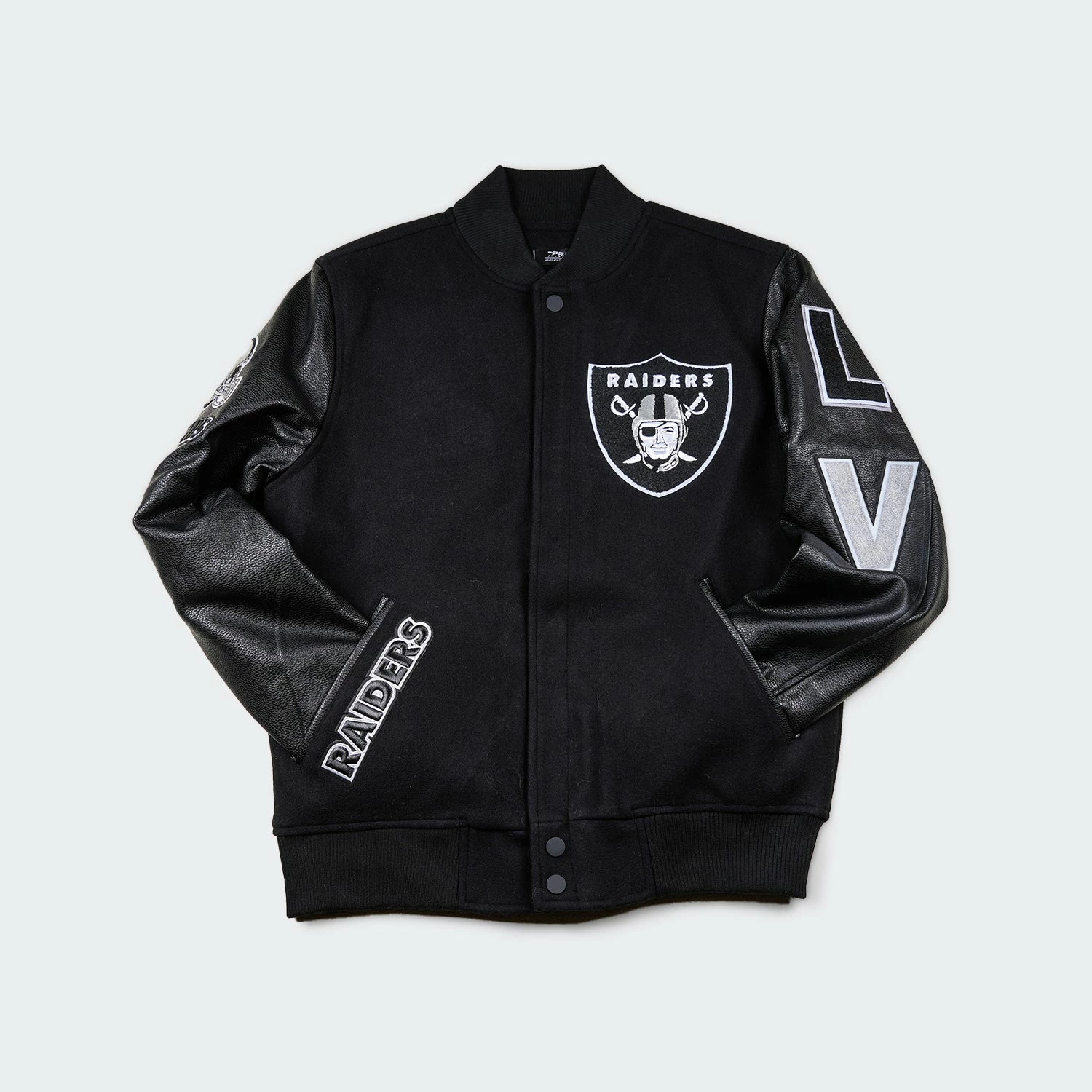 Raiders Fans! This season the Pro Standard Las Vegas Raiders Varsity Jacket comes in a wool body with PU leather sleeves. Embroidered Raiders applique logos decorate this varsity style jacket all around. Tuck your hands in the slip pockets and keep warm with the mock collar. The front closes with a full zipper and snaps.