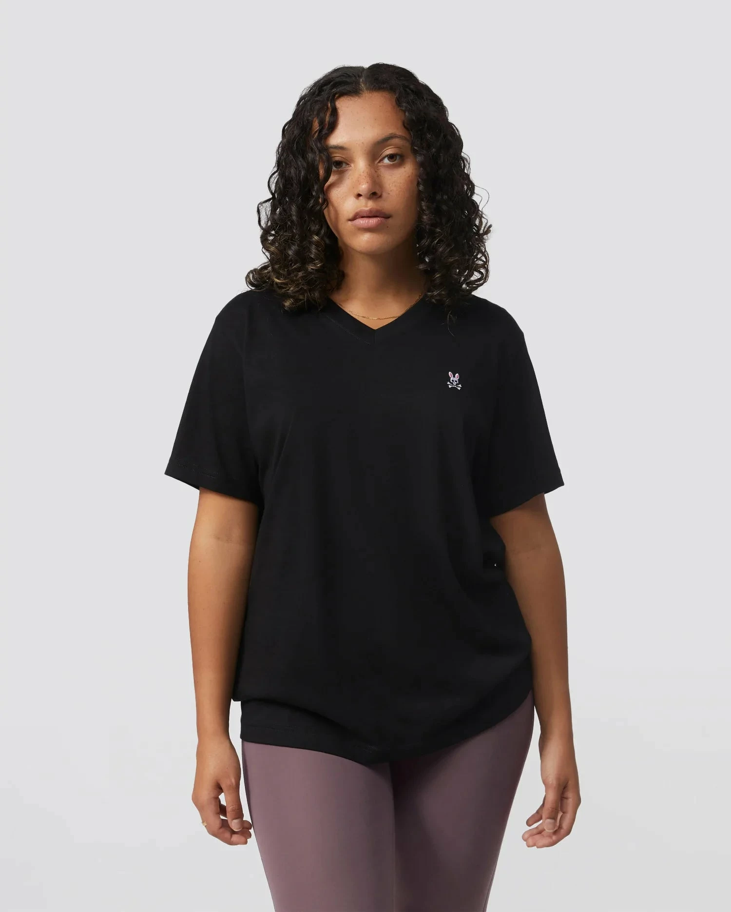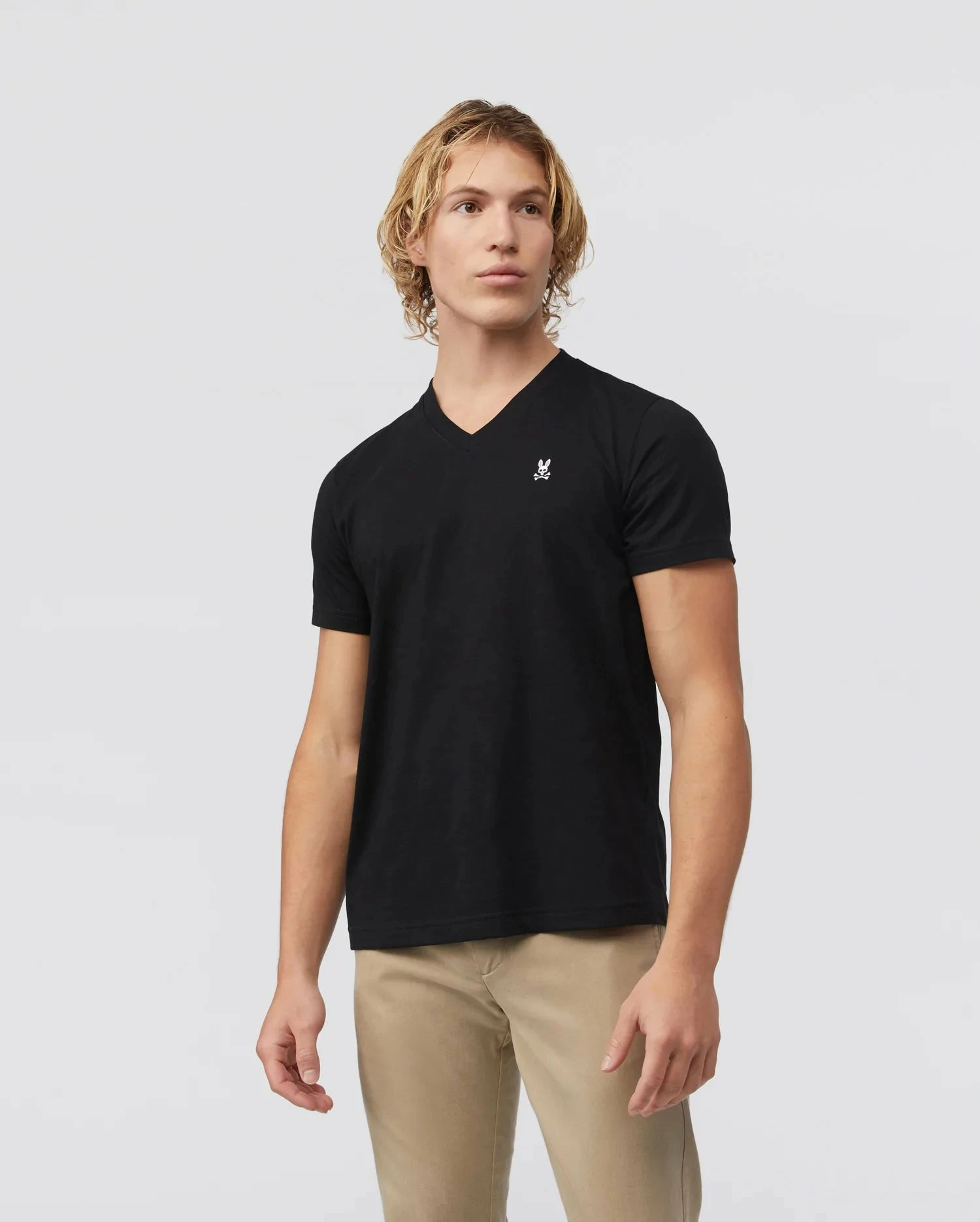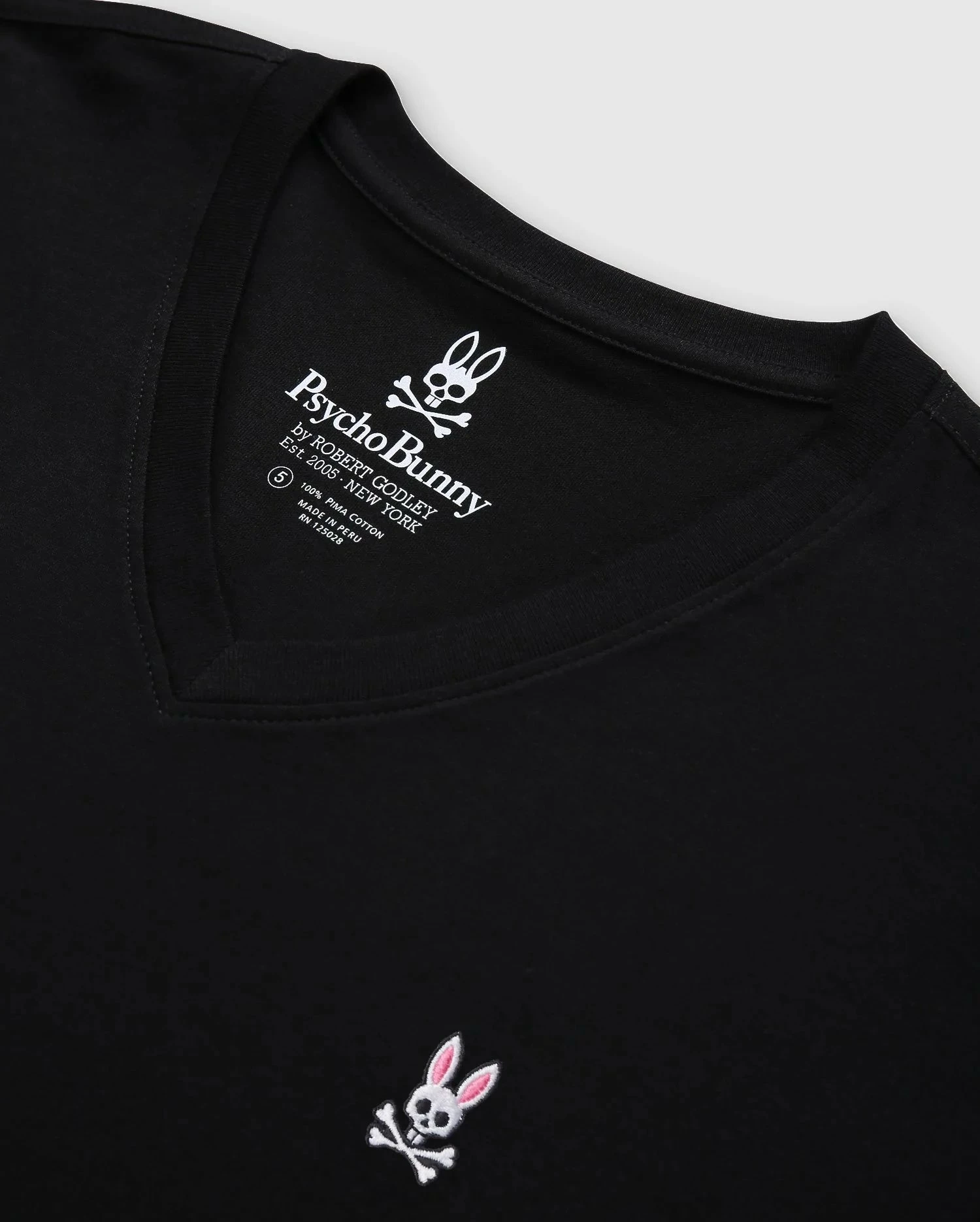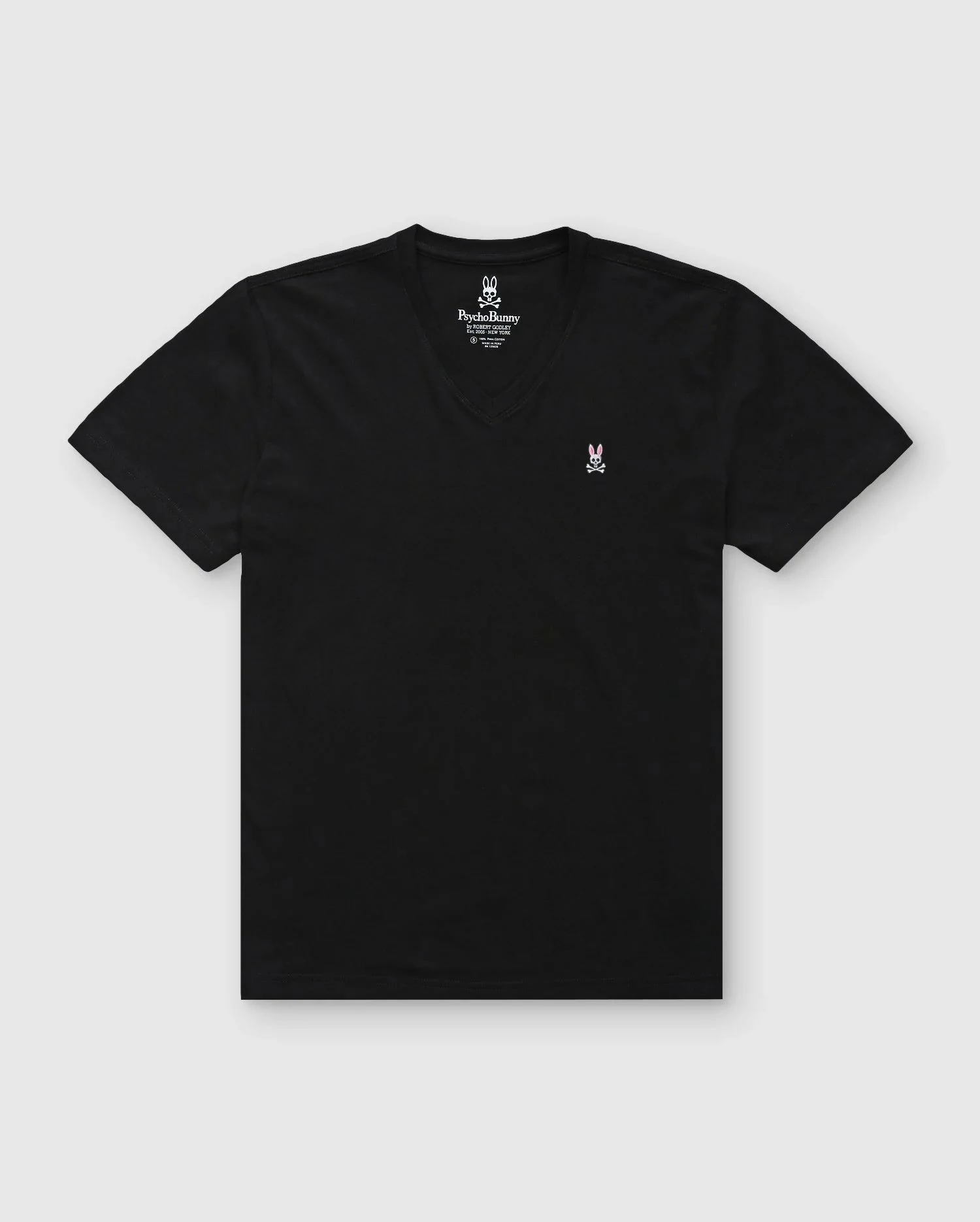 Diversify your collection of t-shirts with the Psycho Bunny Classic V Neck Tee. The 100% pima cotton t-shirt is designed with a sleek V neck and taped seams. Constructed to be a trim fit that sits in between a classic and slim fit. The Psycho Bunny logo is embroidered on the chest. Wear as the centerpiece or makes for the perfect layering shirt.