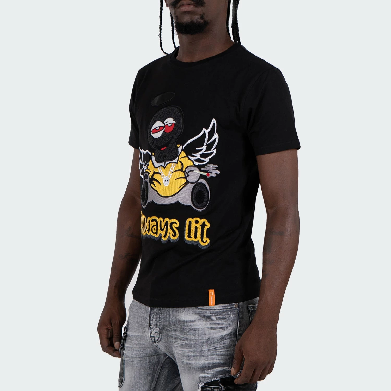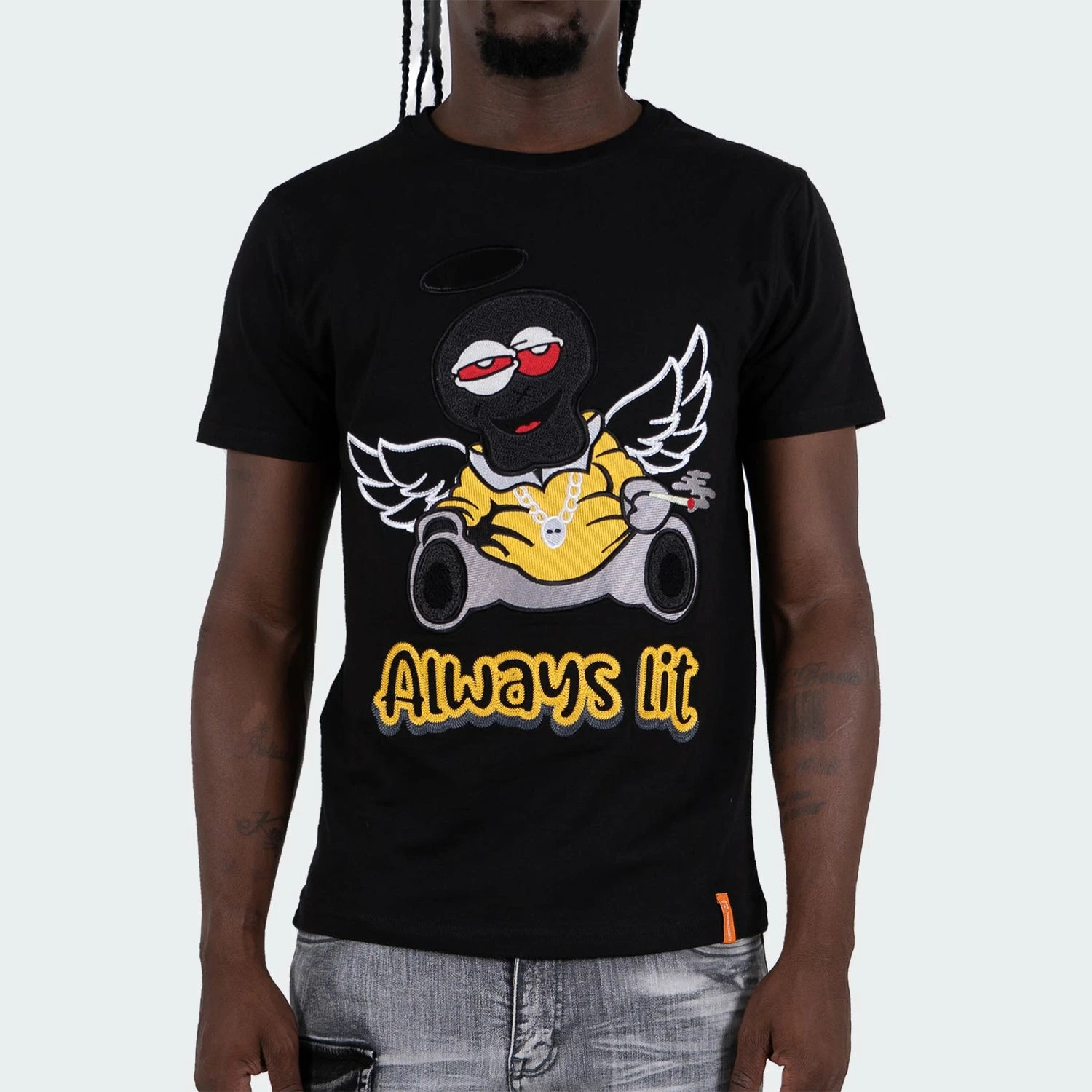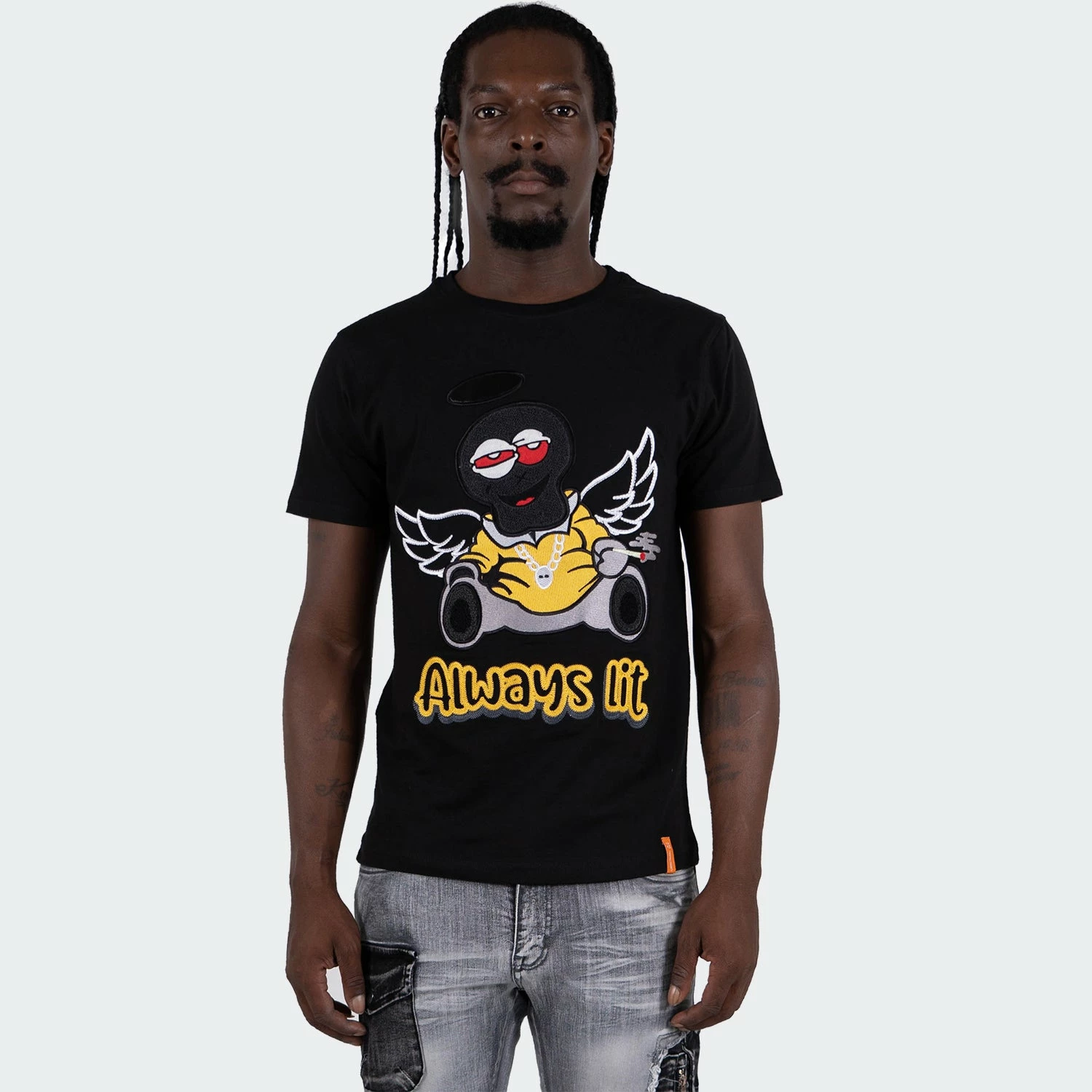 The TWO MILL TWENTY “Always Lit” Graphic T-shirt is an urban street style tee for men inspired by hip hop culture. This black t-shirt is embroidered with a humorous cartoon bad angel character with wings. The “Always Lit” text is made with a fuzzy chenille patch. This high quality men’s black tee is made with 100% cotton and has a classic slim fit. The “Always Lit” angel t-shirt can be paired with your favorite pair of distressed ripped moto denim jeans and your latest pair of Jordan Retros. Wear it alone as a bold statement or layer this men’s embroidered t shirt with an oversized hoodie. You’ll turn heads and give your audience a good chuckle.