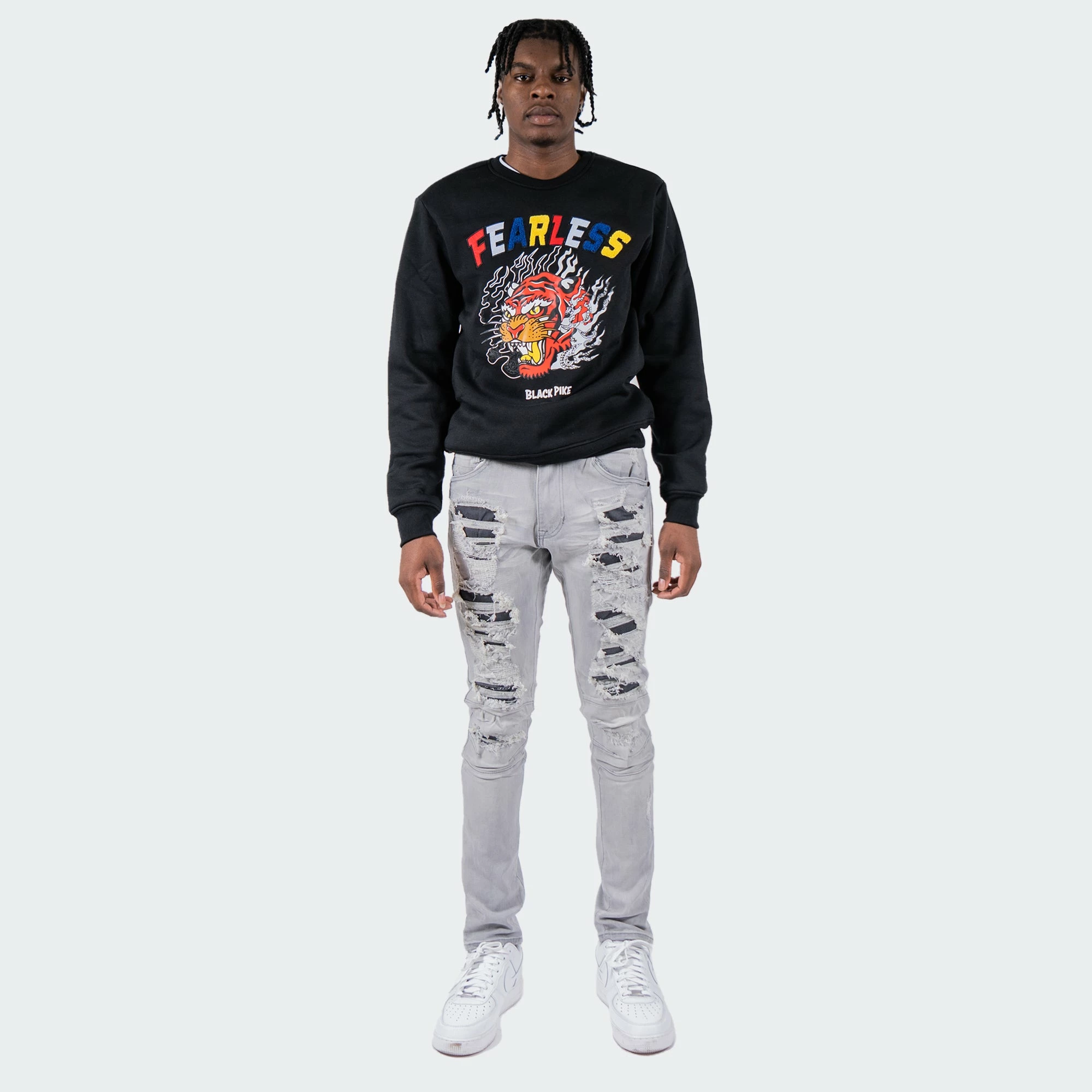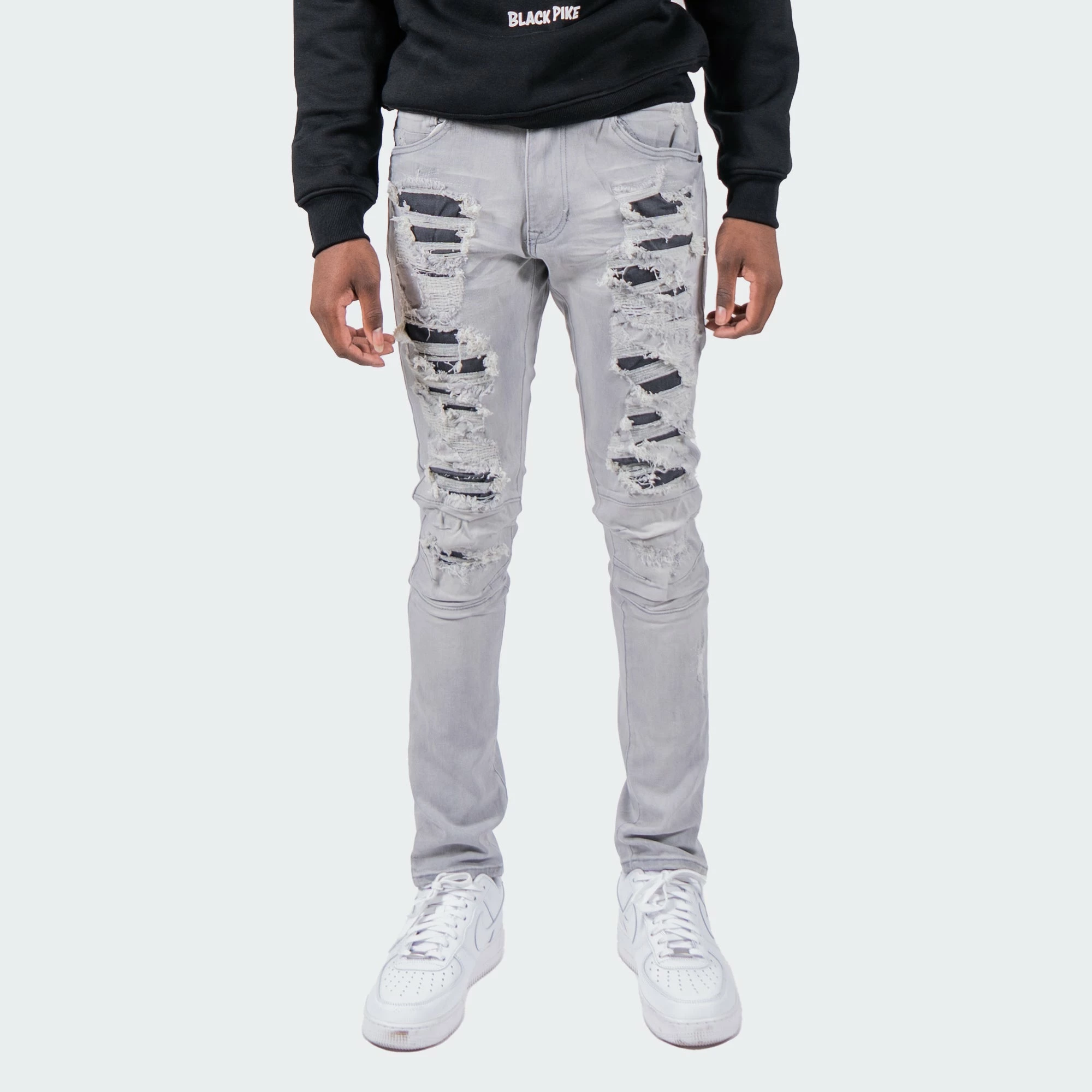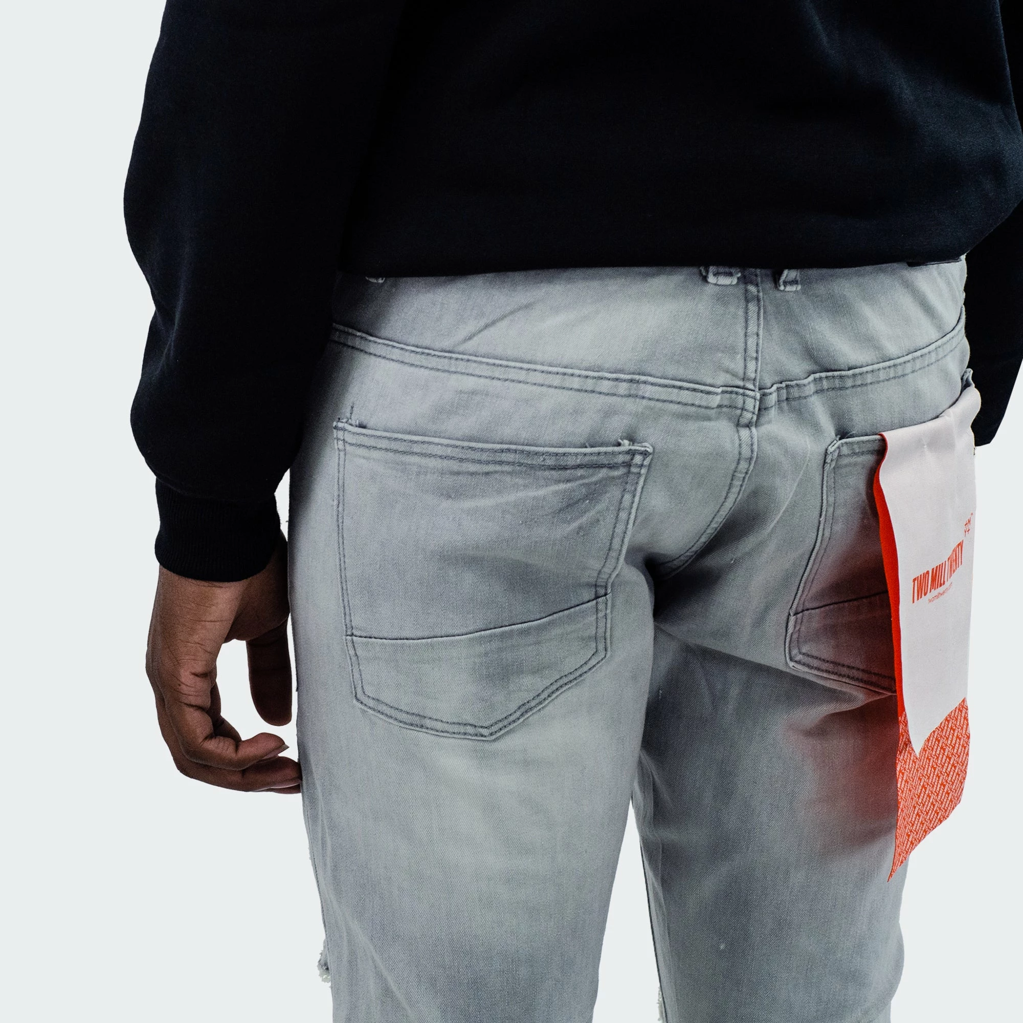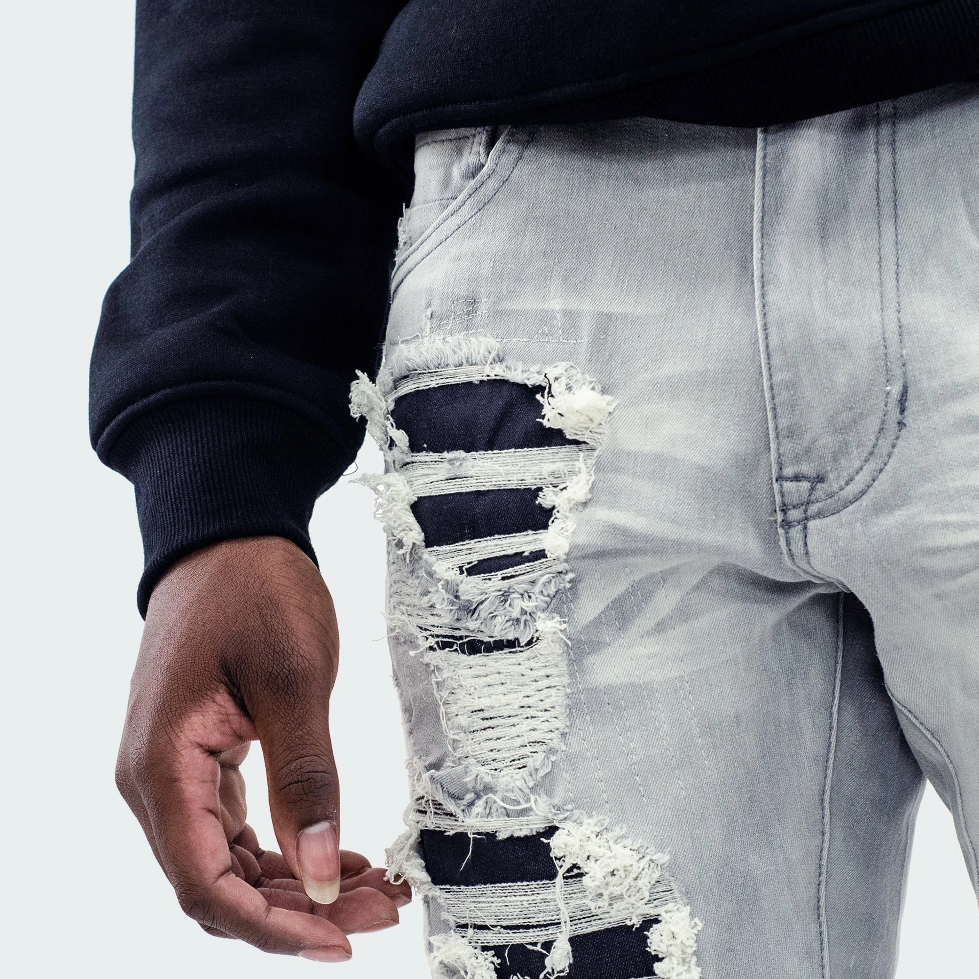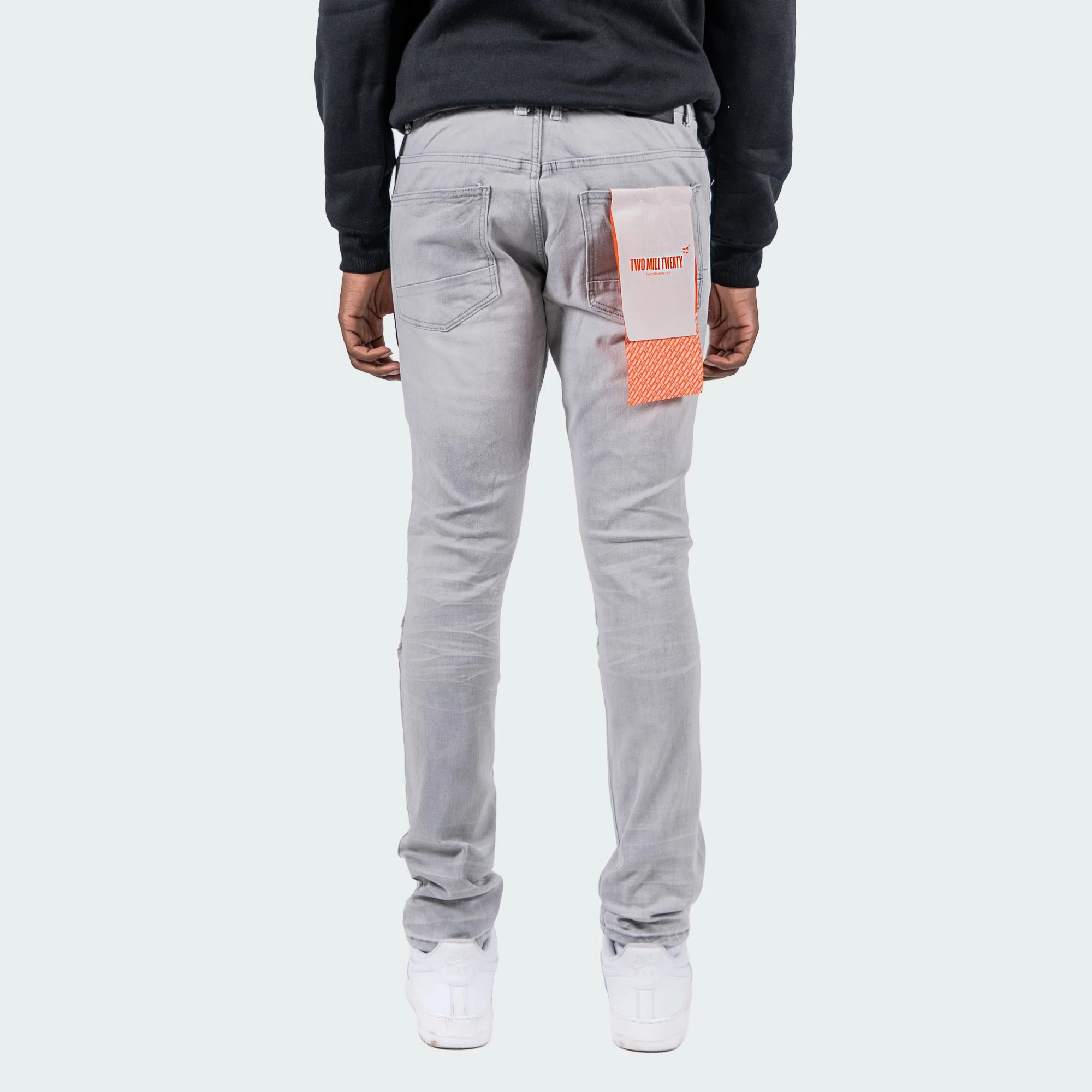 The TWO MILL TWENTY “Ballard” is a premium designer denim jean for men. Inspired by urban hip hop street culture, these fashion light grey men’s jeans have weathered holes along the front of the legs that are backed with a black denim patch. These jeans have a bold personality and can be paired with your latest high top sneaker releases, a team satin bomber jacket and a crisp fitted cap. Made with 98% cotton and stretchy 2% spandex, these men’s grey skinny jeans will be comfy wear after wear throughout the whole season.