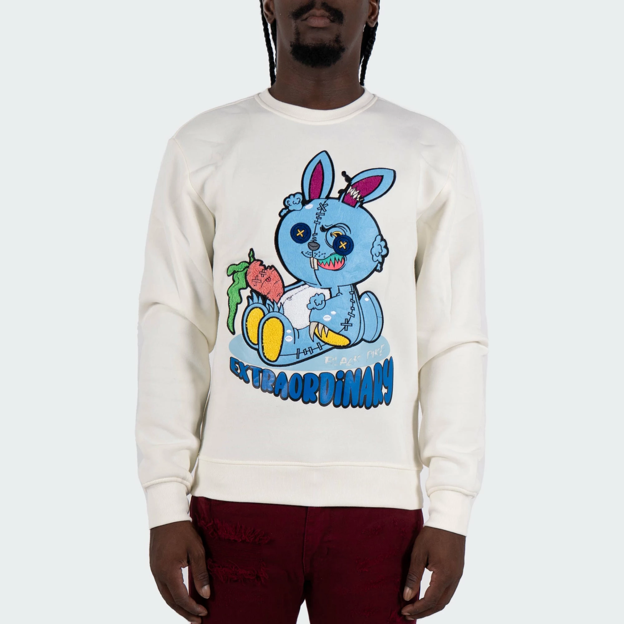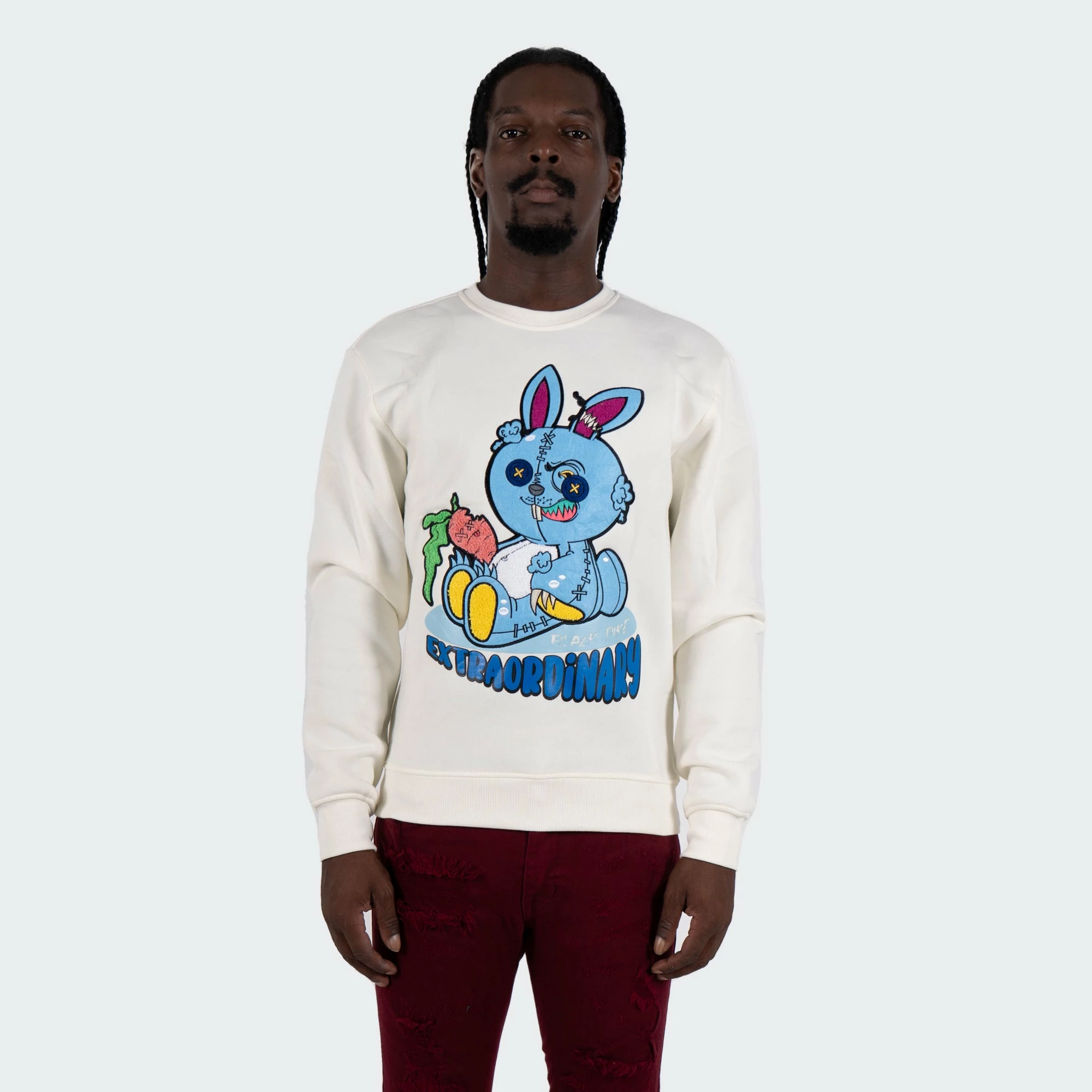 The TWO MILL TWENTY “Extraordinary” Graphic Sweatshirt makes a bold statement with a big angry bad broken button-eye bunny embroidered with a fuzzy chenille patch. This off-white cream crewneck urban street style shirt for men features a not so cute sharp clawed rabbit chomping on a carrot with jagged teeth. Pair this cheeky hip hop top with your worn-in pair of distressed skinny denim jeans, bomber jacket and latest Jordan Retros. Made with super soft 100% polyester fabric, this premium designer hipster sweatshirt will make heads turn wherever you go!