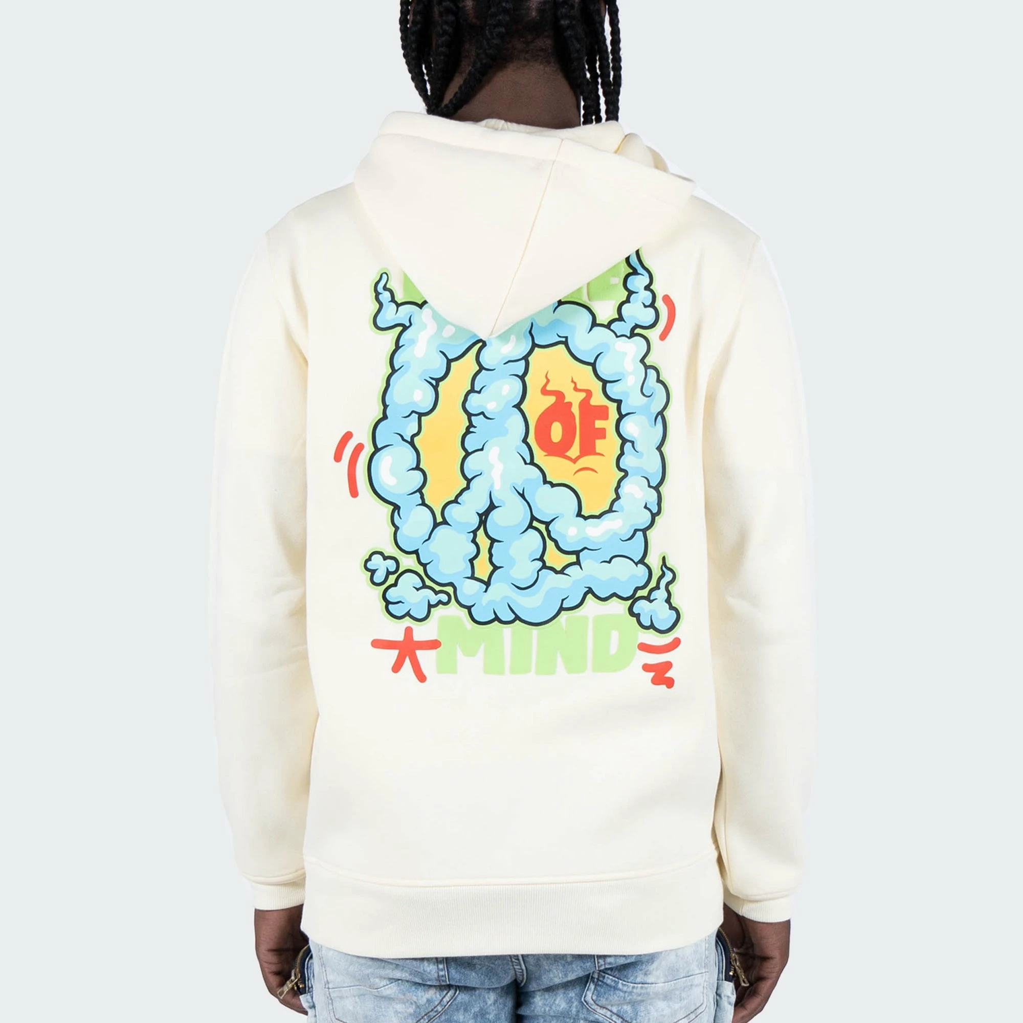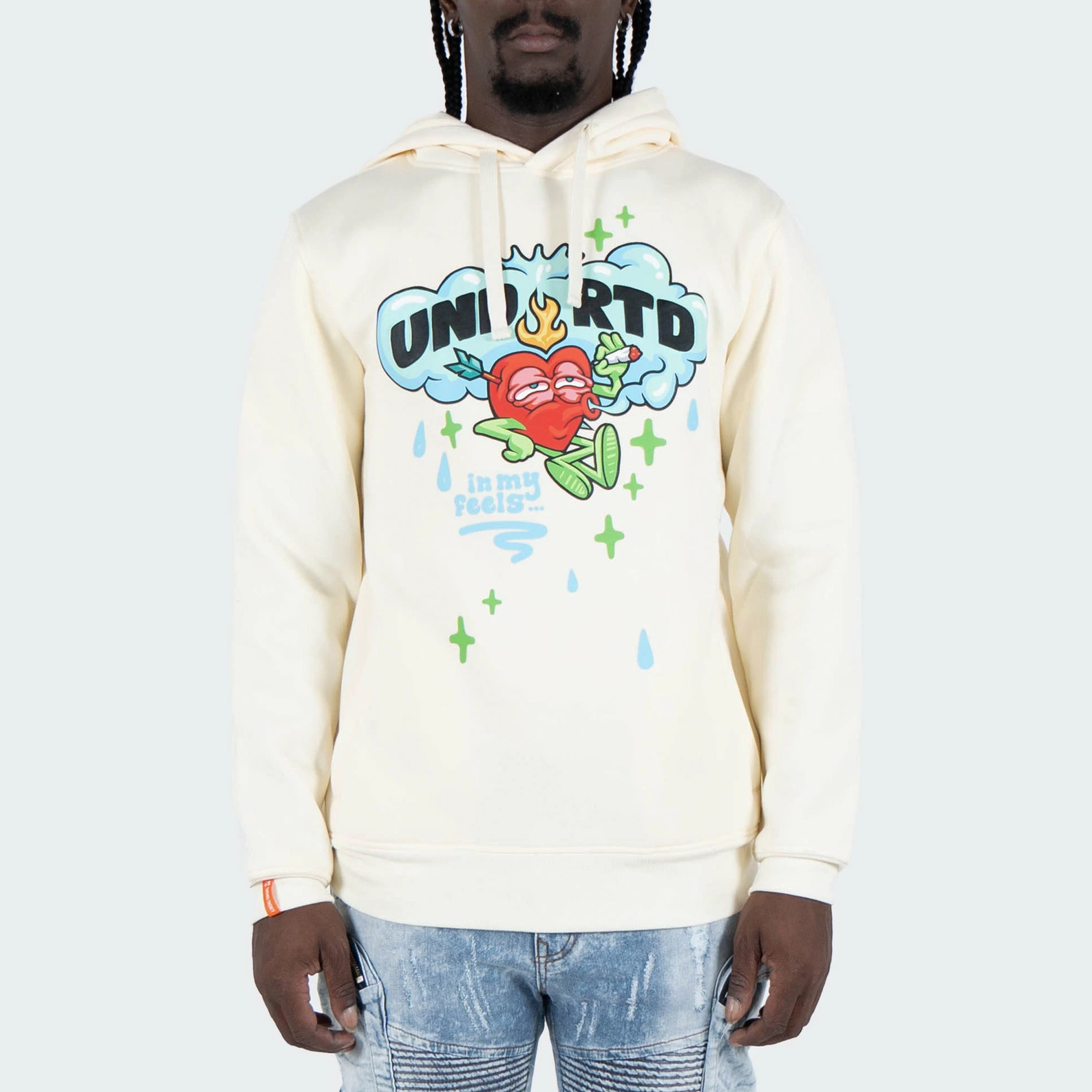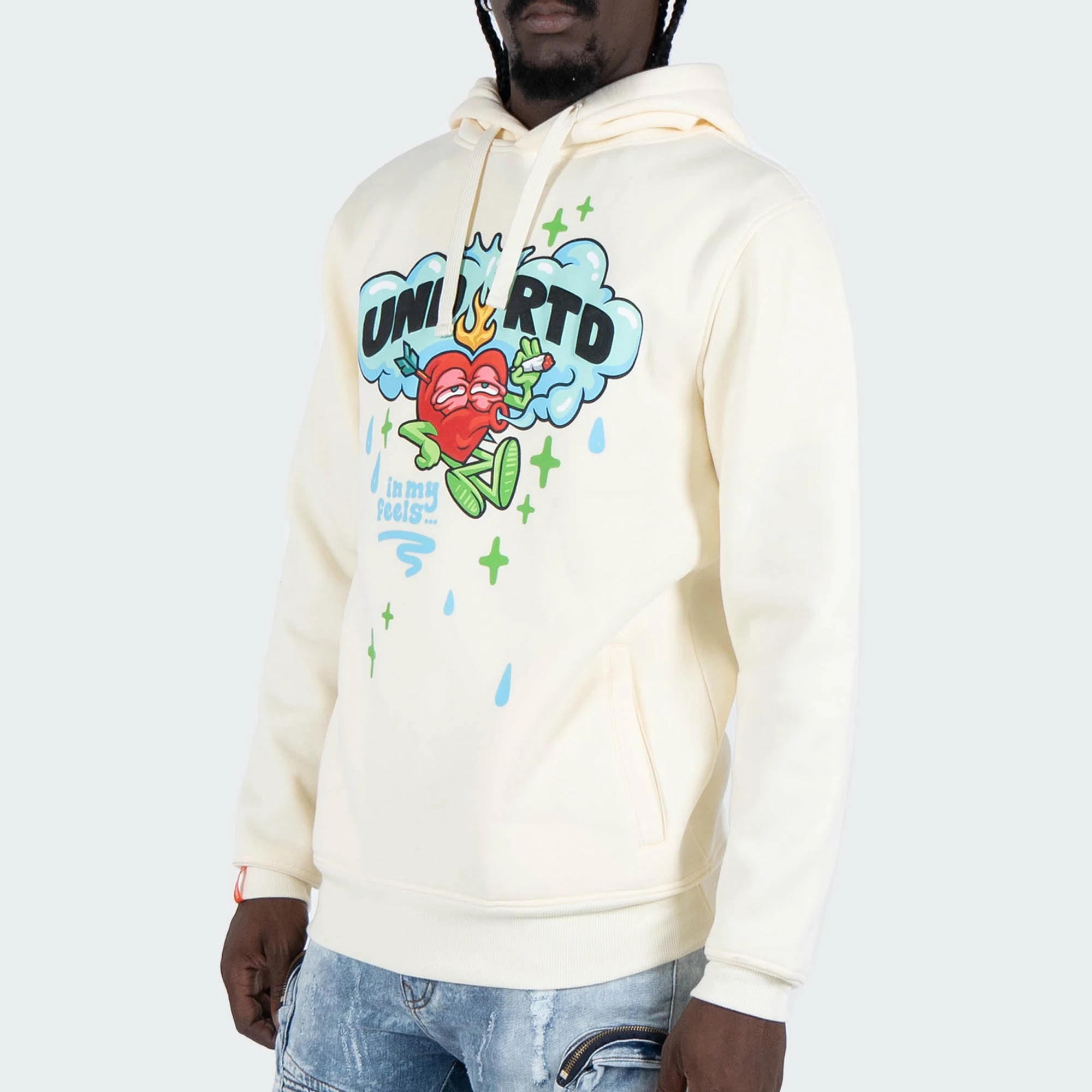 The TWO MILL TWENTY “In My Feels” Hoodie is a hip hop inspired urban fashion streetwear top featuring a comical illustration of a flaming heart character in a cloud of smoke. The UNDRTD text is placed prominently on the front in block letters on this plush off-white cream color hoodie for men. On the back, a large format puffy 3D print with the text PEACE OF MIND sits over a peace sign formed by smoke. Pair this unique graphic sweatshirt for men with your go-to pair of distressed skinny denim jeans, your latest Jordan Retro releases and top off with a crisp New Era 59FIFTY fitted cap.