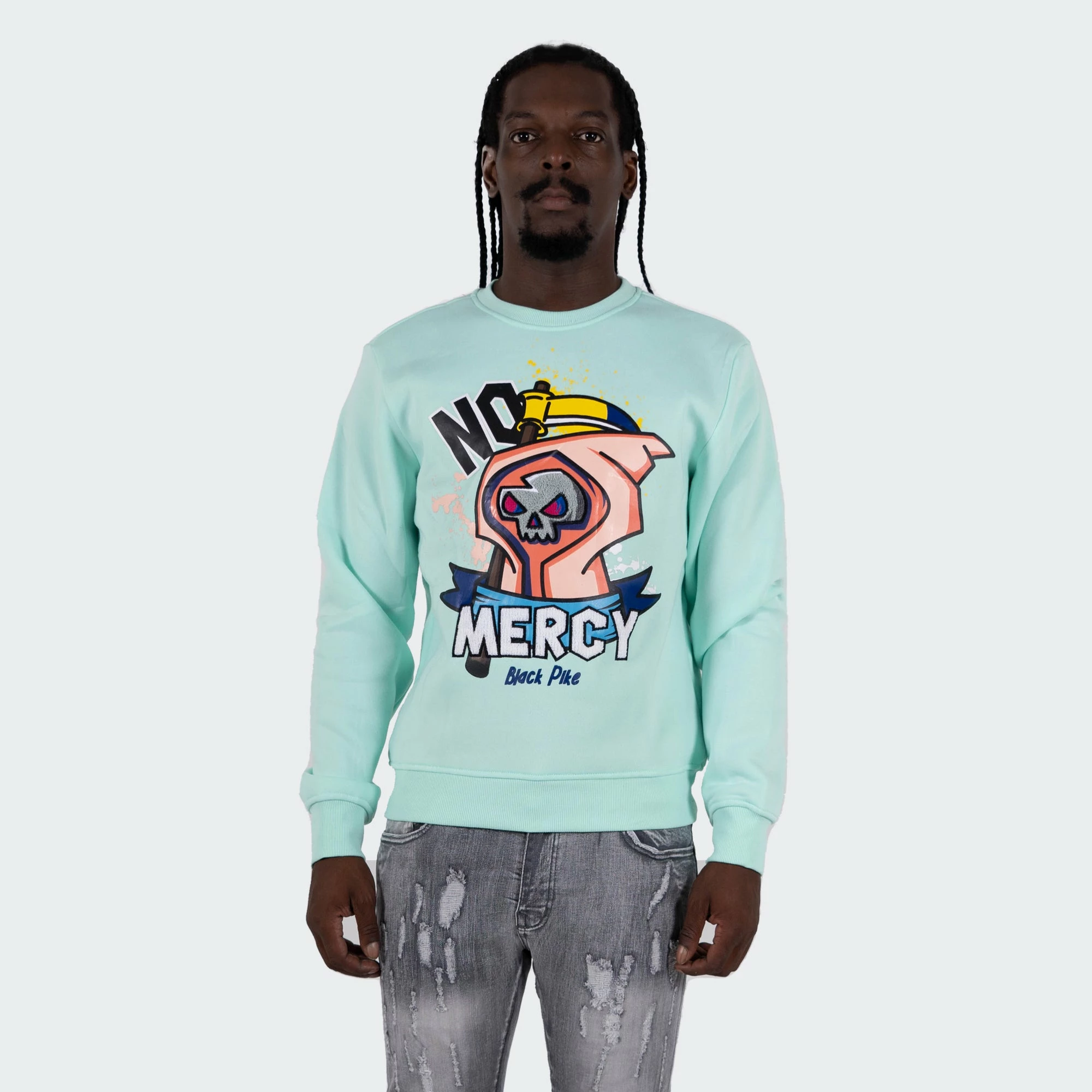 The TWO MILL TWENTY “No Mercy” Graphic Embroidered Sweatshirt knocks on death’s door. The large grim reaper graphic on this men’s light green crewneck shirt has embroidered chenille patchwork dead front and center. This hip hop style urban streetwear shirt can be paired with your go-to pair of skinny fit distressed jeans, your latest Jordan Retros and a satin bomber jacket. Made with 100% polyester fabric, this urban street style fashion sweatshirt will not shrink or lose its shape. Get your bold statement top for men today!