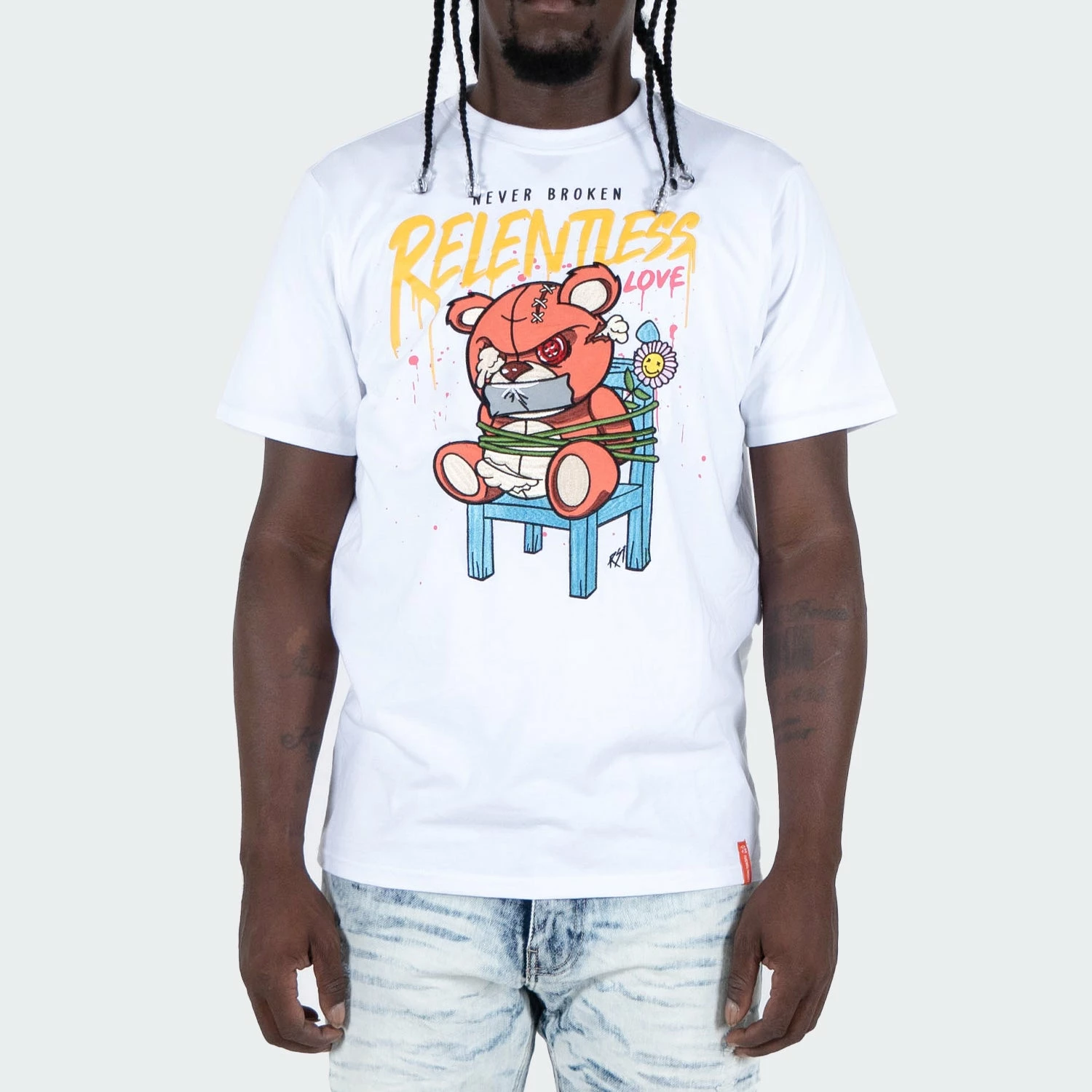 The Two Mill Twenty “Relentless” Graphic T-shirt is an urban style short sleeve tee with a bold mix of jersey patchwork and embroidery on the front. The angry broken teddy bear with button eye is bound to a chair while the text “Never Broken” Relentless Love hangs above its head. This high quality men’s white t-shirt is made of 100% soft spun cotton and has a classic to slim fit. This bright white men’s tee will pair perfectly with your best distressed denim jeans and the latest pair of Air Jordan Retros. Wear it alone to make an edgy fashion statement or layer under a basic hoodie. You’ll break hearts in this graphic t-shirt.