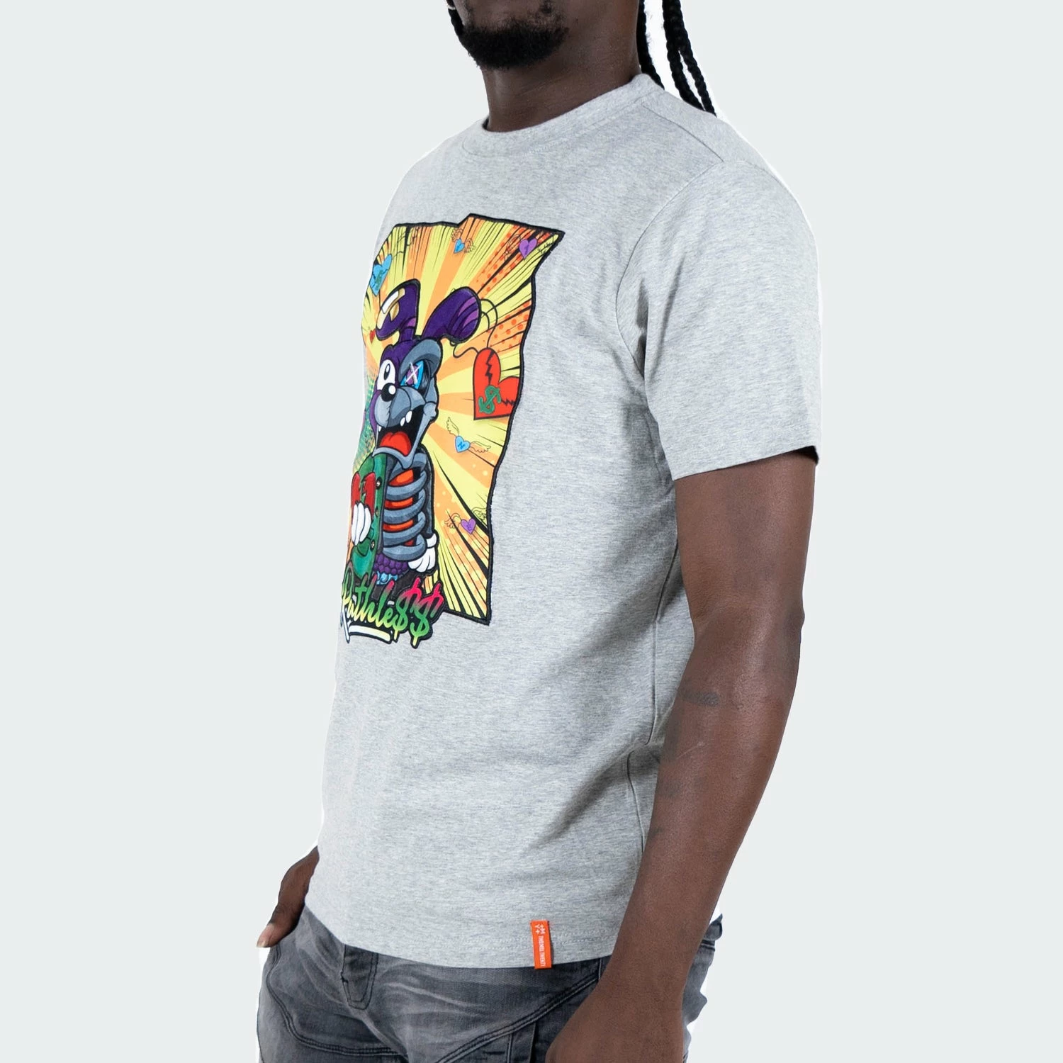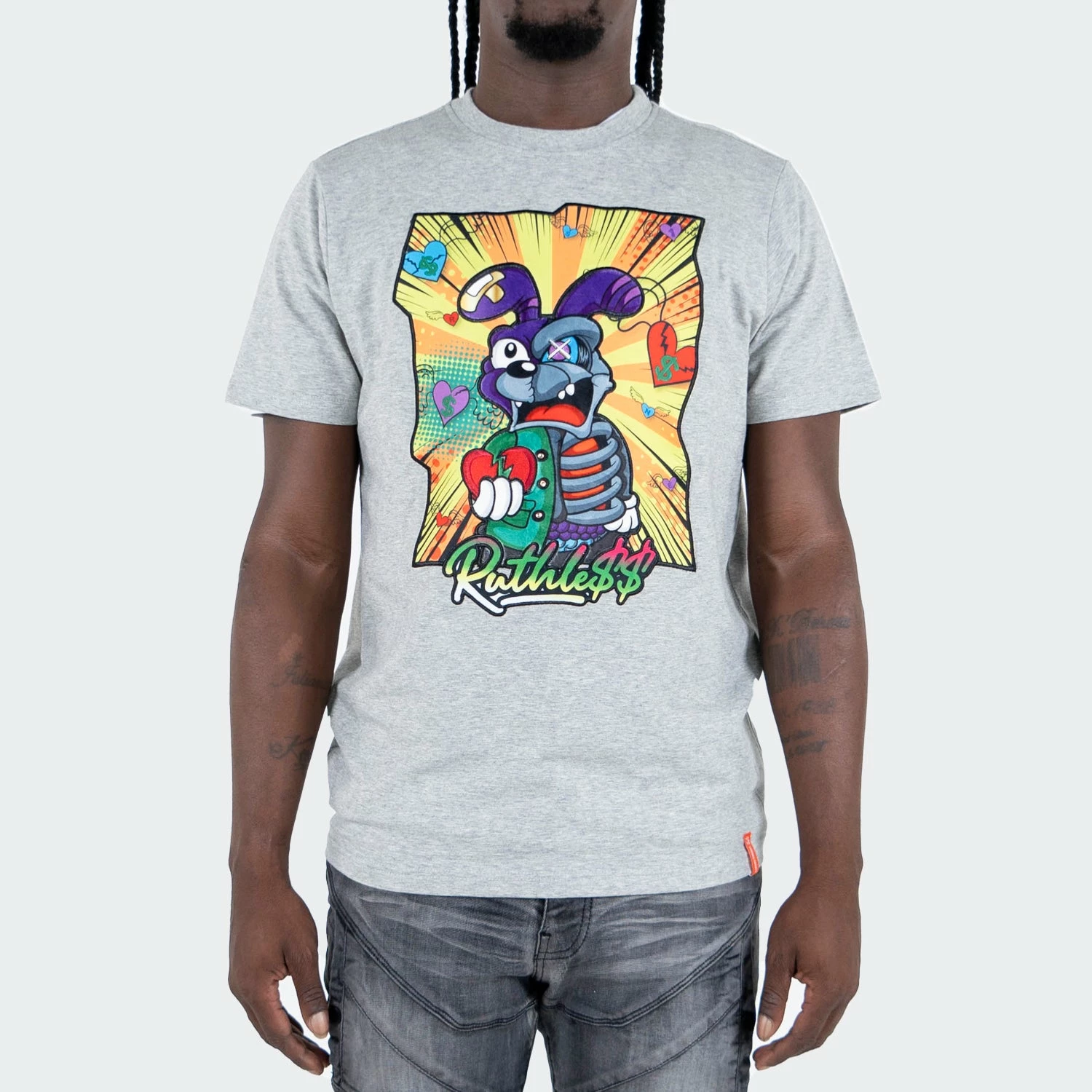 The Two Mill Twenty “Ruthless” Graphic T-shirt is a hip hop inspired urban style short sleeve tee with a bold colorful fuzzy patch embroidered on the front. This street style fashion tee has an edgy rapper vibe with its goth skeletal angry dog holding a broken heart surrounded by dollar signs in winged hearts. This high quality men’s t-shirt is made of 100% soft spun cotton and will pair nicely with your favorite destroyed skinny denim jeans and your latest pair of Air Jordan Retros. Wear it alone to make a bold fashion statement or layer under a simple hoodie. You’ll reach for this ruthless t-shirt on the regular.